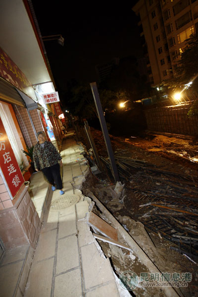 事发地段正处于王先生的裁缝店前。王先生回忆,没有塌陷之前,人行道约有4米宽,中间有绿化带,玉带河堤边上还有长长的钢架护栏。施工以前这个路段就有裂缝,一开始呈分散状态,但到27日下午,门口的人行道开始“不动声色”地沉下去。“一点声音都没有,就是缓缓地沉,直到1米高的护栏和地面持平,才停止塌陷。”