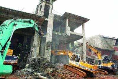 昨日下午,6台重型炮机同时开工,被“直通车”曝光、位于宝安区民治街道龙岸小区旁的9栋违建别墅轰然倒塌。在现场督战的宝安区副区长、民治街道党工委书记李勇告诉记者,违建拆除后将进行围合式管理,政府部门也将尽快完成征地工作,彻底杜绝违建回潮。