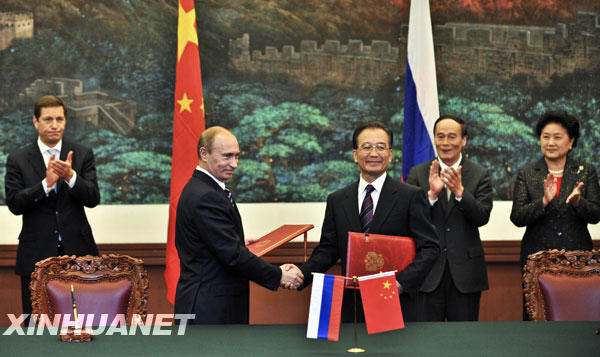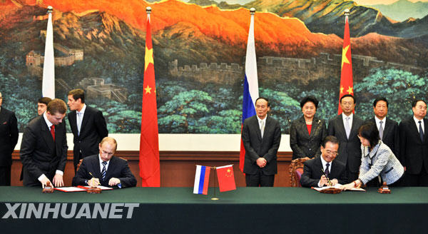10月13日,国务院总理温家宝与俄罗斯总理普京在北京人民大会堂签署《中俄总理第十四次定期会晤联合公报》。新华社记者谢环驰/摄