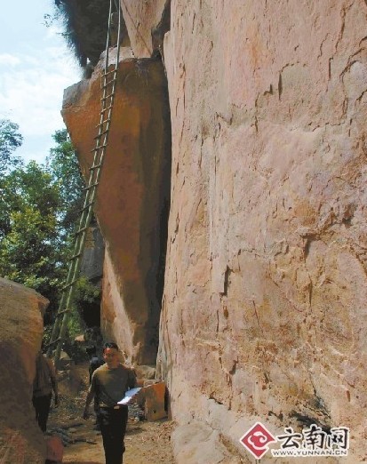 虽然这些岩画年代久远,不过自绘制出来之后,一直隐藏在民间。岩画所处位置距离河底约100多米高,调查时,工作人员使用梯子才能爬上去拍照。