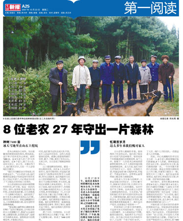 8人每天一早带着干粮进山,天黑踏着月色返回驻地,遇到防火季节,就裹着一条毛毯,露宿在林子里。这样没有一分钱报酬的护林工作,他们一做就是30年。如今,8人都已经成了暮年老人,但30年间,林场没有发生过一起火险,树木成活率也一直保持在85%以上。对于这个特殊的群体,本报曾在2007年派出记者进行专题报道。老人的感人事迹和他们走过的那段艰难岁月感动了我们无数读者。
