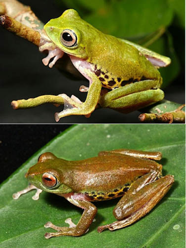 此外还有一种会变色的青蛙,也称为飞天蛙。它们在夜晚的皮肤是绿色的,而白天则变成褐色的,而且眼睛的颜色也随着皮肤颜色改变。它们当然不能像鸟类那样飞,只能能够从在树木间短距离滑翔。