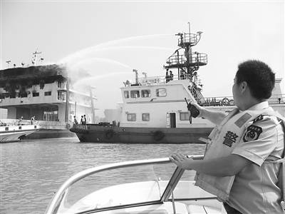 侦察报告显示,失火船只为重载滚装船“万州河牛986”,船上有船员30余人,该船2楼和3楼已经完全被大火吞没并伴有滚滚浓烟。