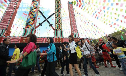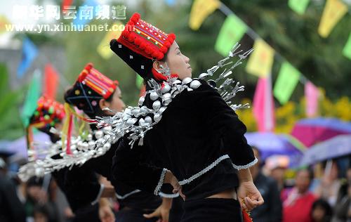 当日正值国庆节,在云南省昆明市郊的云南民族村内,少数民族群众和游客载歌载舞,庆祝中华人民共和国成立61周年,祝福祖国繁荣富强,民族团结进步。 新华社记者 蔺以光 摄