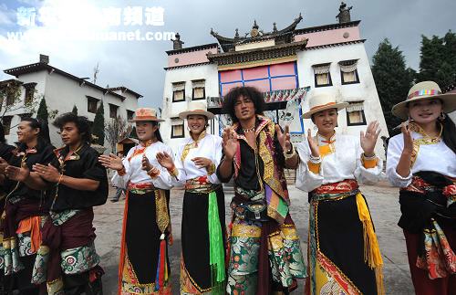 10月1日,一些藏族青年在云南民族村内载歌载舞,喜迎国庆。