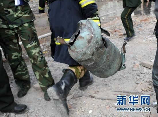 4月19日,一名消防队员捡回发生爆炸的气体瓶。当日下午16时20分许,兰州大学第二附属医院一旧建筑拆除工地发生气体瓶爆炸,造成2名施工人员当场死亡,7人受伤。 聂建江/摄