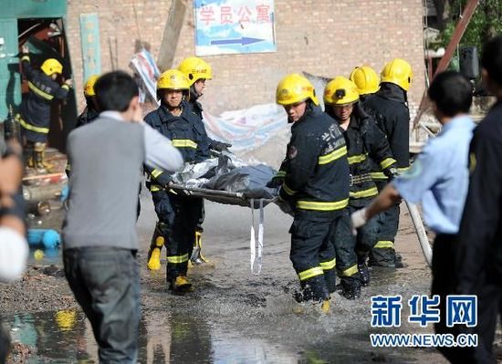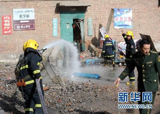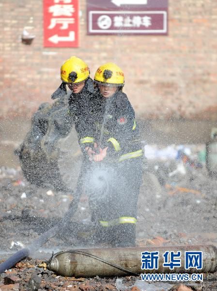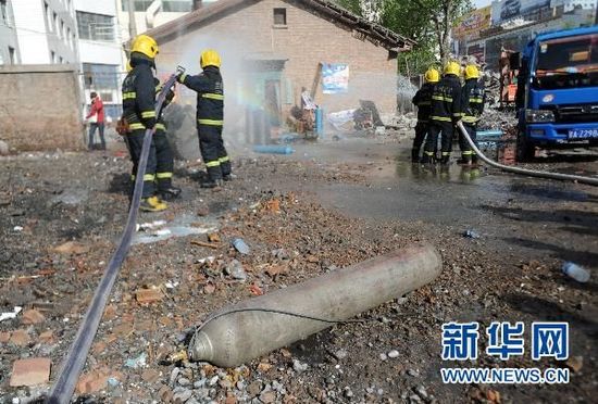4月19日,兰州市消防支队特勤大队消防人员在现场给气体瓶降温。当日16时20分许,兰州大学第二附属医院一旧建筑拆除工地发生气体瓶爆炸,造成2名施工人员当场死亡,7人受伤。聂建江/摄
