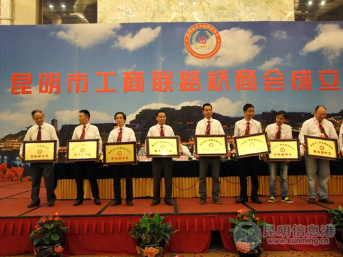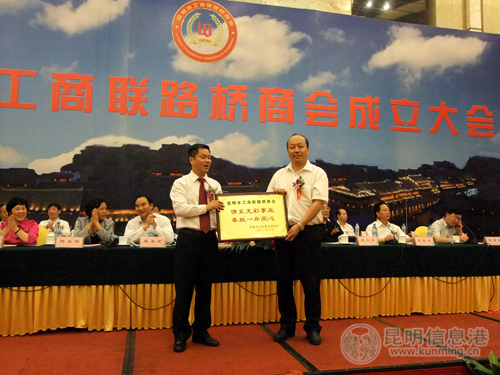 市委常委、统战部部长金志伟向昆明市工商联路桥商会授牌。记者韩焕玉摄