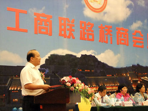 昆明市委常委、统战部部长金志伟在市工商联路桥商会成立大会上讲话。记者韩焕玉摄