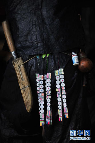 岜沙汉子左腰别刀,右腰别着牛角火药桶和装铁砂的葫芦。他们还把相思带挂在身后,相思带越多也就意味着爱慕者越多(2011年11月17日摄)。新华社发(田卫涛摄)