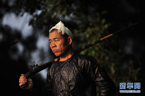岜沙汉子肩上扛枪,犀利的目光中透出自信(2011年11月17日摄)。新华社发(田卫涛摄)