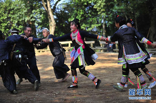 岜沙人在表演婚恋习俗,岜沙汉子从娘家人手中抢过“新娘”(2011年11月16日摄)。新华社发(田卫涛摄)