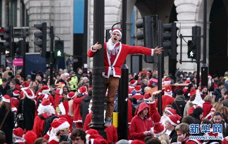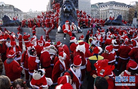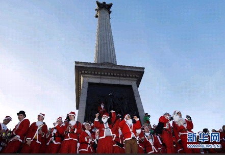在英国伦敦的特拉法加广场,数百人身穿圣诞老人服装聚集在这里,参加“圣诞老人聚会”。 新华社/路透