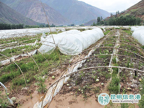 端午节前的几场雨,让饱受旱灾之苦的村民欣喜若狂。干死的洋芋、枯萎的玉米已经无救了,而对于红薯、稻谷等一些正在生长的农作物,这无疑是天降甘露。可是对于在东川区小江河谷边上种植西瓜的浙江瓜农来说,几天的阴雨给他们造成200万元的损失——他们租地种植的900多亩西瓜被洪水淹没。
