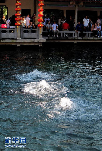 10月17日,游客在济南趵突泉观看喷涌的泉水。济南趵突泉自10月2日开始水位一路下跌,半月时间内已下跌35厘米,跌破29米关口,这样的跌幅在近年同期都是没有的。据了解,趵突泉水位下跌与近期降雨明显偏少和秋种地下水开采量增多有关。新华社记者 徐速绘/摄