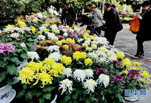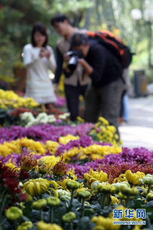 10月23日,游人在济南趵突泉公园欣赏菊花。当日,第33届济南市菊花展在山东济南趵突泉公园拉开帷幕。此次菊展共展出200余个菊花品种、十多万盆菊花、26组菊花造型,规模为历年之最。菊展期间还将举办插花、摄影、书画、戏曲、菊花研讨会等多项文化游园活动。本次菊展将持续至11月25日。新华社发(赵晓明/摄)