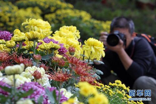 10月23日,摄影爱好者在济南趵突泉公园菊花展上拍摄盛开的菊花。当日,第33届济南市菊花展在山东济南趵突泉公园拉开帷幕。此次菊展共展出200余个菊花品种、十多万盆菊花、26组菊花造型,规模为历年之最。菊展期间还将举办插花、摄影、书画、戏曲、菊花研讨会等多项文化游园活动。本次菊展将持续至11月25日。新华社发(梁志杰/摄)