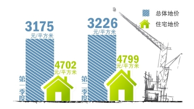 数据显示,上半年我国主要城市地价总体水平连续上涨。今年第一季度,全国105个重点监测城市的地价总体水平为3175元/平方米,同比增长3.86%,环比增长1.25%。其中,商业、住宅、工业地价分别为5964元、4702元、676元/平方米,同比分别增长4.53%、4.12%和3.27%,环比分别增长1.19%、1.86%和0.57%。