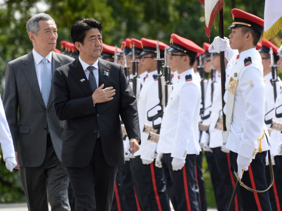 资料图:新加坡总理李显龙(左一)接待到访的日本首相安倍晋三。