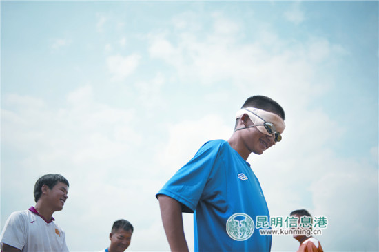 八九月的昆明依然炎热,但训练时,李海福仍然坚持戴着眼罩提前熟悉状态,他今年14岁,是球队中年纪最小的球员