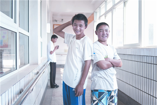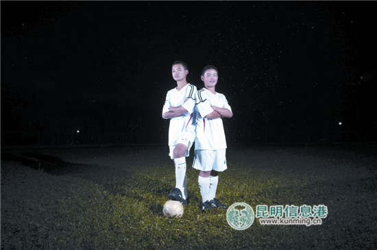 李海福(左)14岁,周靖鹏(右)16岁。他们俩是球队中最小的队员,接触盲人足球才2个多月。刚刚开始踢球时,他们都很担心奔跑时会被撞倒,但经过一段时间的集训,两人都完全不一样了。