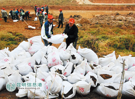 昨日上午9点半,在禄劝掌鸠河县城段的东山桥边,“保护母亲河 全民共参与”、“加强河道综合整治 创和谐人居环境”等标语悬挂在掌鸠河河道两侧,此时的气温只有0摄氏度,寒意十足。掌鸠河一边的堤岸上,却是一派热火朝天的场面:数百名禄劝干部职工顶着寒风,奋力挥下手中的锄头,将河岸中常年淤积的泥土挖起,装入防洪袋中堆放到岸边,每个人都积极投入、干劲十足。据了解,全县3000余名干部职工分为4组,分别在两天时间里分段完成清淤工作。禄劝县水务局局长李庭裕介绍:“本次进行的掌鸠河清淤活动,是多年以来规模最大的一次,主要通过机械挖掘,在枯水期内抓紧清理河底淤泥,明年春节前,完成掌鸠河县城段3公里和南塘河1公里河道内7.2万立方米淤泥清除,掌鸠河县城段的防洪、泄洪能力将大大提高。”清淤工作完成后,禄劝将投资800余万元,在掌鸠河东山桥边建起一座如同瀑布的景观闸门,通过调整、控制河流水位,届时将形成掌鸠河县城段10余公里绿化长廊及河道“水清岸绿”的靓丽景观。