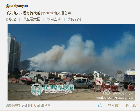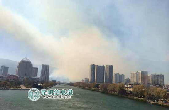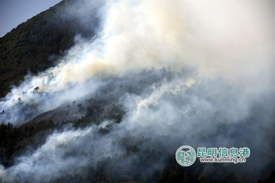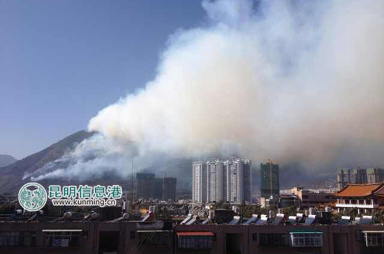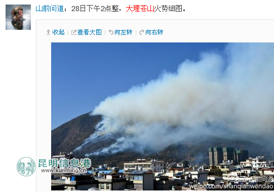 大理苍山发生山火 下关城区烟雾弥漫
