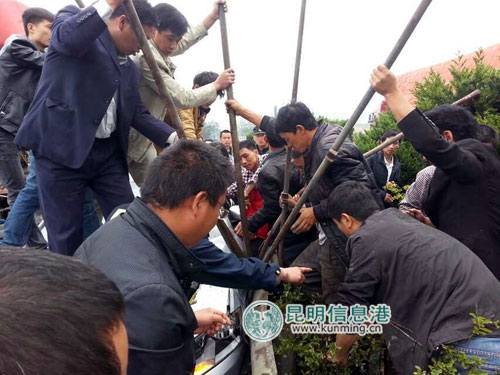 5月2日昆明地区普降中雨和大雨,道路状况较差。杭瑞高速公路K2137处(昆明至曲靖段)路面十分湿滑,一辆失控的重型大货车撞到一辆小轿车,受损后无法移动的货车将该轿车死死夹在钢质防护栏上,轿车内两名伤者又被卡在轿车左侧与牢固的钢质防护栏上,其中一人伤势较重。