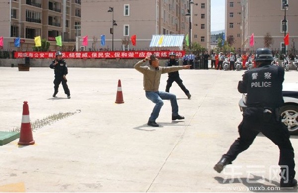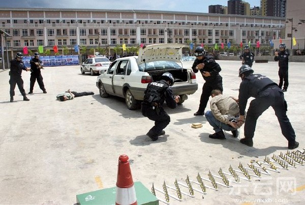 “嫌疑人”手持菜刀冲下车,向民警挥舞,随着一声枪响,一张网从天而降将其双手捆住,民警随即冲上前将其制服……昨日14时,宜良县汤池镇的演练基地上,面对持械贩毒、暴力袭警等镜头,数百位观众都捏了把汗。