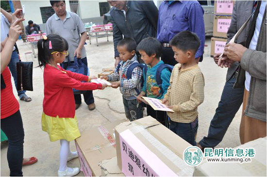 学校捐赠的物品价值万余元,是过儿童节的时候通过让孩子们捐旧玩具、家长爱心拍买等方式筹得,爱心物资包括每个学生一个书包,一套学习用具及若干体育用品。幼儿园还拿出爱心款项为特困生们发放了3000元现金资助。贝迪雅幼儿园的孩子们为朵马嘎小学的新朋友们表演了节目,孩子们一起做游戏、切蛋糕,一起度过了一个既欢乐而又充满意义的下午。