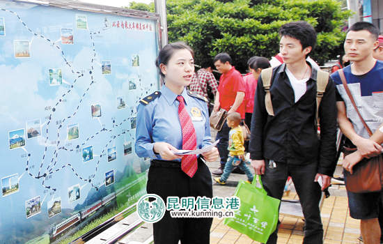 昆明铁路局收集了从昆明始发的各趟列车沿线的景点资料,设计制作出精美的铁路旅游攻略图,让旅客轻松成为铁路旅游达人。 记者赵伟/摄