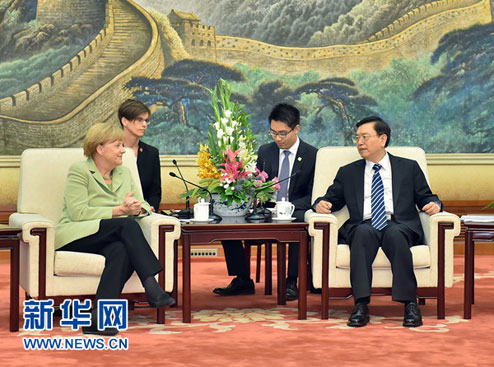 7月7日,全国人大常委会委员长张德江在北京人民大会堂会见德国总理默克尔。 新华社 记者李涛/摄