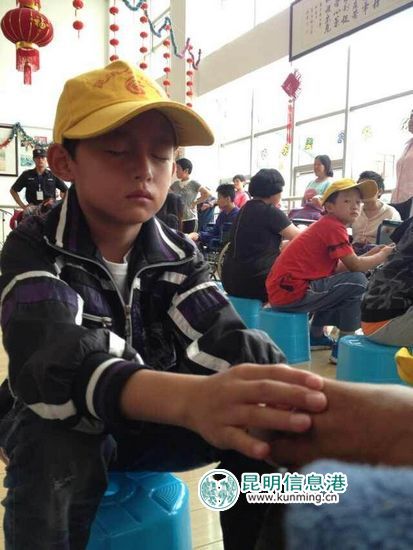 “爷爷,请您过来这里坐,我们先为您测视力,稍后医生会给你们做更详细的检查。”8月4日—5日,昆滇小记者们跟随昆明普瑞眼科医院的医务人员,来到昆明市社会福利院为这里的孤寡老人、残障人士义诊。孩子们自由结合成小组,分工协作,有的搀扶老人,有的为老人帮椅子,有的测视力。虽然非“科班”,但在普瑞眼科医院医生的指导下,小记者们都将自己的工作做得有模有样。“爷爷,你的视力左右眼都是0.6,平时眼睛有没有不舒服?如果眼睛干涩这里有眼药水哦!”在为老人义诊的同时,孩子们仍不忘关心他们。当孩子们发现其中一位爷爷的视力达4.6时,纷纷围住爷爷,采访他平时怎样保护眼睛。