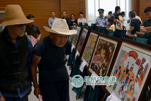 农民画展厅展出了呈贡16个民间绘画家的40副精选作品。讲解员介绍,这些画都是呈贡当地的农民在业余时间创作出来的,呈贡区人才办组织农民画家进行培训。请专人讲解群众路线的内容、意义,并带领他们到实地参观考察、采风,用了大概10天的时间创作出了这些画。