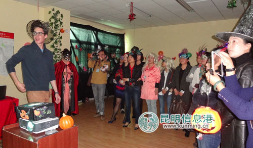 装扮成万圣节妖怪的学员正在玩“trick-or-treat”的游戏。记者张薇/摄