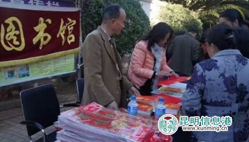 1月26日,在官渡区图书馆姚馆长的带领下,区图书馆宣辅部工作人员到关上街道文化站赠送图书,在官渡广场为广大市民送去门神、农家历、对联,并赠送精美的书签、窗花和宣传册,同时,还邀请书法家现场免费为市民书写春联。