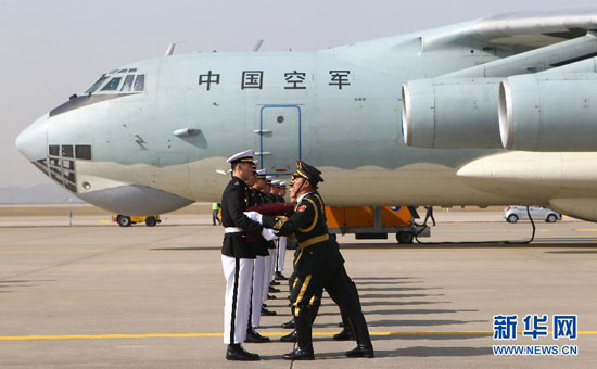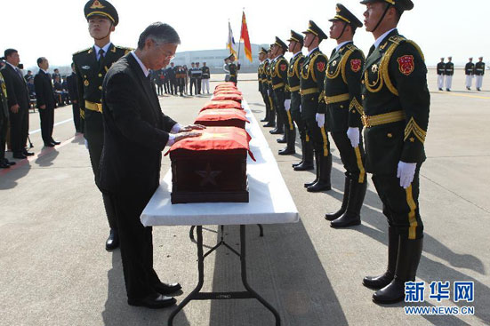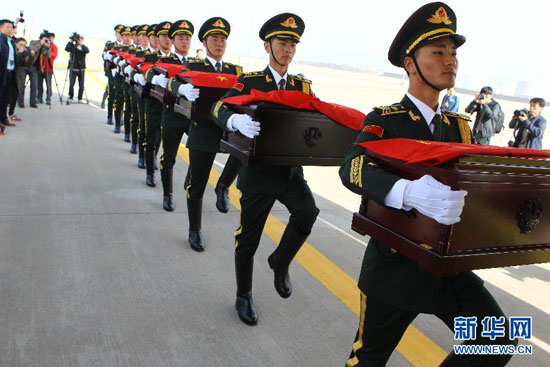 3月20日,在韩国仁川国际机场,中国驻韩大使邱国洪(前左)为中国人民志愿军烈士遗骸棺椁覆盖中国国旗。当日,中韩双方在韩国仁川机场再次对2014年发掘确认的志愿军烈士遗骸进行交接。根据中韩双方达成的共识,对在韩国发掘的中国人民志愿军烈士遗骸,每年清明节前协商交接。2014年3月28日,中韩双方曾举行了在韩中国人民志愿军烈士遗骸首次交接仪式。新华社 记者姚琪琳/摄