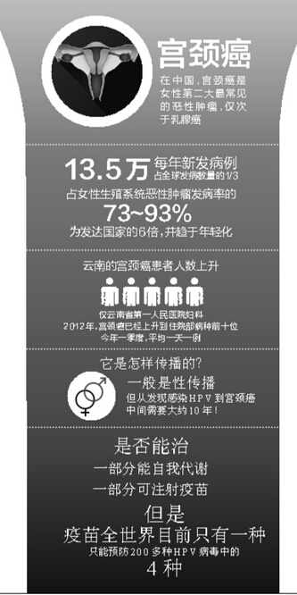 每年的4月15-21日是“全国肿瘤防治宣传周”。尽管大多数癌症一旦发现都是晚期,但有两种癌症可以早期发现,一种是乳腺癌,另一种就是宫颈癌。但近几年,云南的宫颈癌患者人数却在不断上升。随着宫颈癌疫苗的风靡,不少女性对这种可以防癌症的疫苗趋之若鹜。云南省第一人民医院(昆华医院)妇科副主任医师袁涛坦言,宫颈癌疫苗的确可以预防某些HPV病毒,但并不是全部。