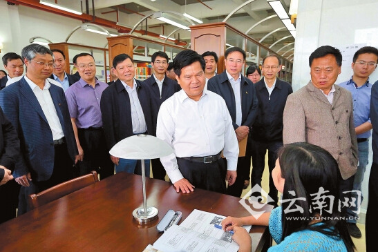 4日,李纪恒在云南大学图书馆与同学交谈,了解他们的学习生活情况。记者雷桐苏/摄