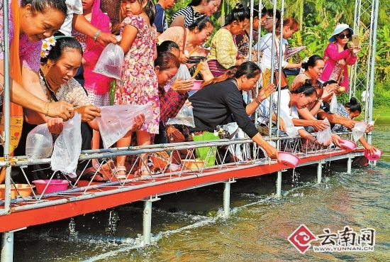 傣族群众放流幼鱼苗。