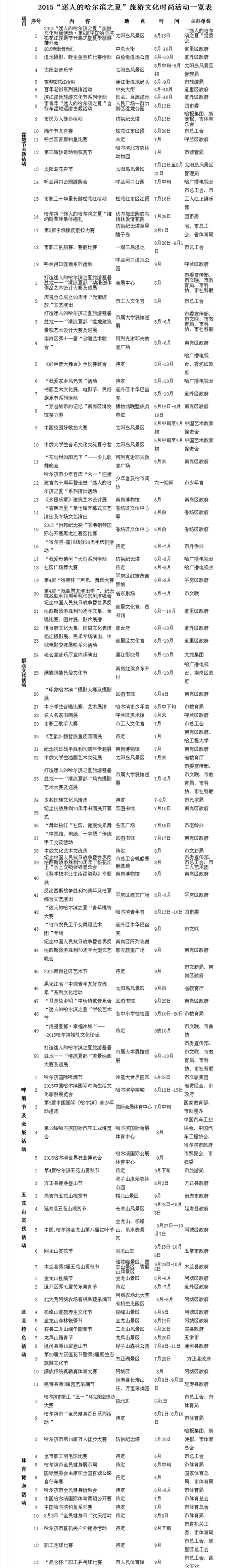 2015“迷人的哈尔滨之夏”旅游文化时尚活动将于6月至10月举办,其间将开展多项活动。
