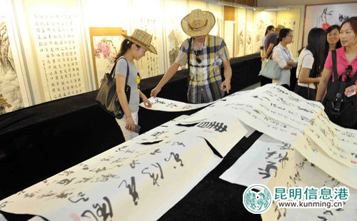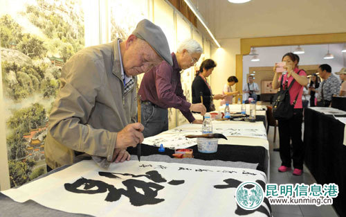 据悉,这是盘龙区文化馆携手金殿名胜区联合举办的“反腐倡廉进公园”活动,金殿成为昆明市首家开展此类活动的公园,用书画展等贴近市民的形式宣传清廉之风。现场受到很多市民喜爱,纷纷向老人们求字,还有市民带着孩子到现场观看,并在老人指导下练习毛笔字。