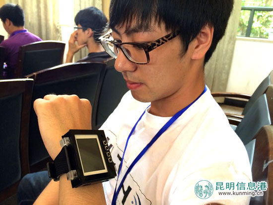 赵江波向记者展示Watch-me腕表 记者樊炫/摄