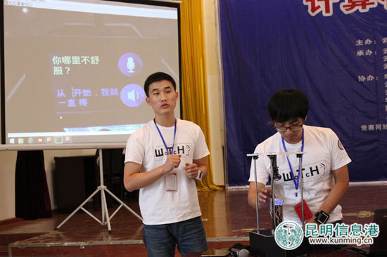 “Watch me”是一个聋哑人智能传感交互设备,由昆明理工大学学生程正涛和赵江波共同研发。该设备外观为一块智能手表,当人佩戴后,其可通过手势智能识别、按键语音播放、外部环境震动等方式,实现与普通人的正常交流,充分体现了对聋哑人士的人文关怀。该设备运用了智能云、DeepQA技术、自学习系统、NLU等技术,采用智能分词算法,建立了独立的手势样本数据库,并最终将技术成功移植到自主设计制作的腕表中。在答辩环节,两位同学用生动幽默的动画短片、精彩的演说和成熟的技术征服了现场评委和观众,该作品最终以全场最高分夺得了本次大赛一等奖。