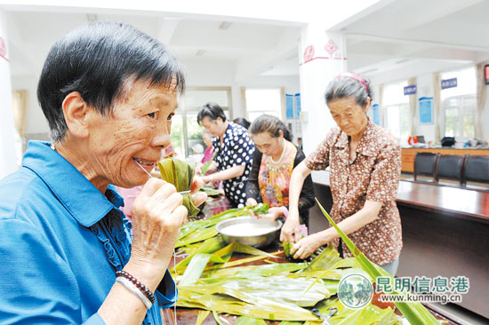 双手轻轻卷棕叶,舀上米,左缠右绕,再把绳子系紧……不一会儿一个个饱满充实、形态各异的粽子就包好了。昨天,盘龙区联盟街道长寿路社区居民自己动手包起粽子,每个人脸上洋溢着快乐的笑容。
