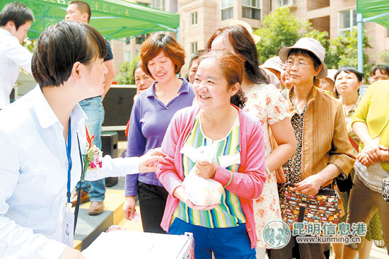 一大早,宜良乡鸭湖前繁花似锦,茶花、君子兰、玫瑰、月季、红掌争相斗艳,石榴、蓝莓、芒果、柠檬、大枣、木瓜等果树的树苗齐聚。石斛、红豆杉、雪松、重楼等一些珍惜植树的身影也不少。一些花卉公司还将花卉摆放成造型别致的“园林”,引来游人拍照留念。