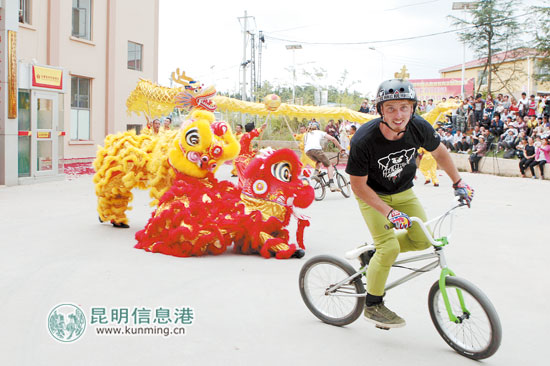 当小轮车遇上舞龙。记者杜文蕾/摄