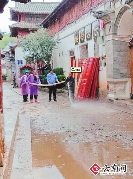 昨日一进古城,地上到处是黄色泥浆,工作人员拿着高压水枪和扫帚冲刷着地面,各客栈、商铺的老板也拿着水桶和水管冲洗自家门前的泥浆。一家餐馆负责人黎先生向记者透露,“我们门前这条小河的水凌晨都漫出来了,把门前这个木桥都给冲歪了,桥上还有两盆80多斤重的盆栽,也被水冲走了,到现在都没找到!说真的,来丽江这么多年还从没见过这么大的雨,太吓人了!”