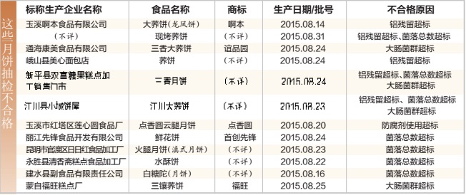 据省食药监局负责人介绍,此次抽检覆盖曲靖、玉溪、大理、丽江、红河、文山、普洱、版纳、楚雄、保山、德宏、昭通、昆明等13个州(市)和滇中产业新区,重点检测了月饼中铅、苯甲酸及其钠盐、亚硝酸盐、糖精钠、甜蜜素、安赛蜜、铝的残留量、防腐剂、菌落总数、大肠菌群、致病菌、霉菌等指标。