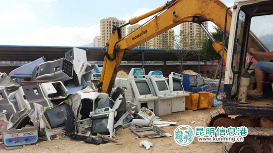 7月份以来,富民警方通过常态化巡逻防控工作,在辖区的娱乐场所、出租房和废旧物品收购站等地进行地毯式排查,先后收缴到捕鱼机、苹果机、老虎机等多种类型的赌博机20余台。9月13日,富民警方在开展危废物品场所清理过程中现场查获127台正在装车准备运走的游戏机,经后期鉴定81台属于赌博机性质的游戏机。经询问,游戏机是一名收购废品的老板从富民县大营一个仓库里收购来的,准备拉往昆明后转运至广东。